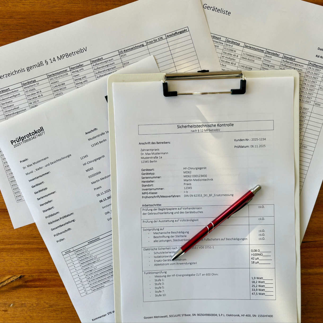 Im Rahmen einer umfassenden Bestandsaufnahme werden von mir alle geprüften Geräte inventarisiert, vollständige Gerätelisten ausgearbeitet, gesetzlich geforderte Bestandsverzeichnisse/Medizinproduktebücher erstellt und alle Prüfprotokolle archiviert. Sämtliche Unterlagen, Listen und Protokolle werden in digitaler Form zur Verfügung gestellt.